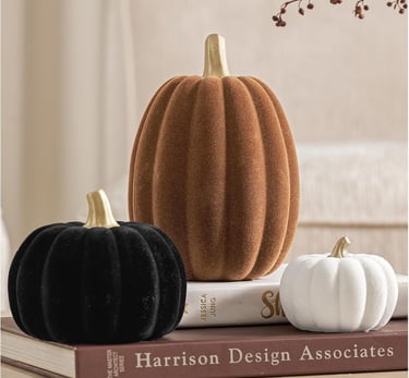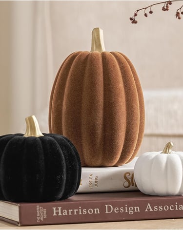 Chic pumpkins in a flocked finish, warm neutrals tones and perfect for your coffee table.